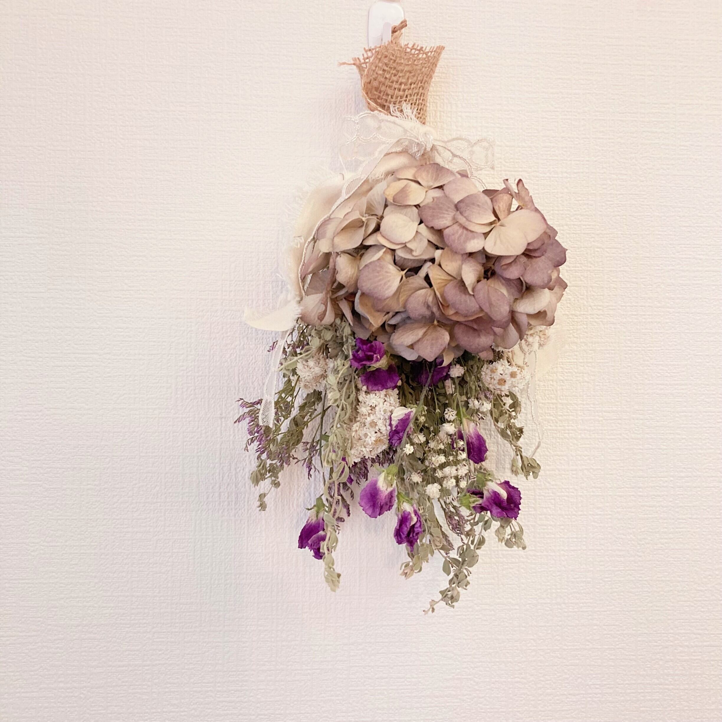 コロンとしたあじさいをメイン花材に使用した丸みあるスワッグです。