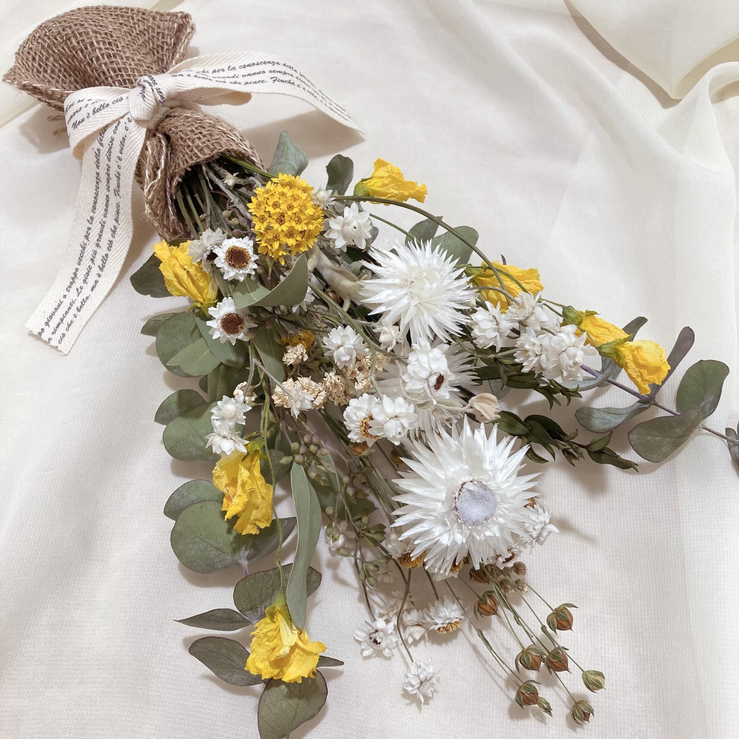 使用花材:ユーカリ、黄花ローダンセ、シルバーデージー、スイートピー、花あま、アンモビューム、アキレアパール