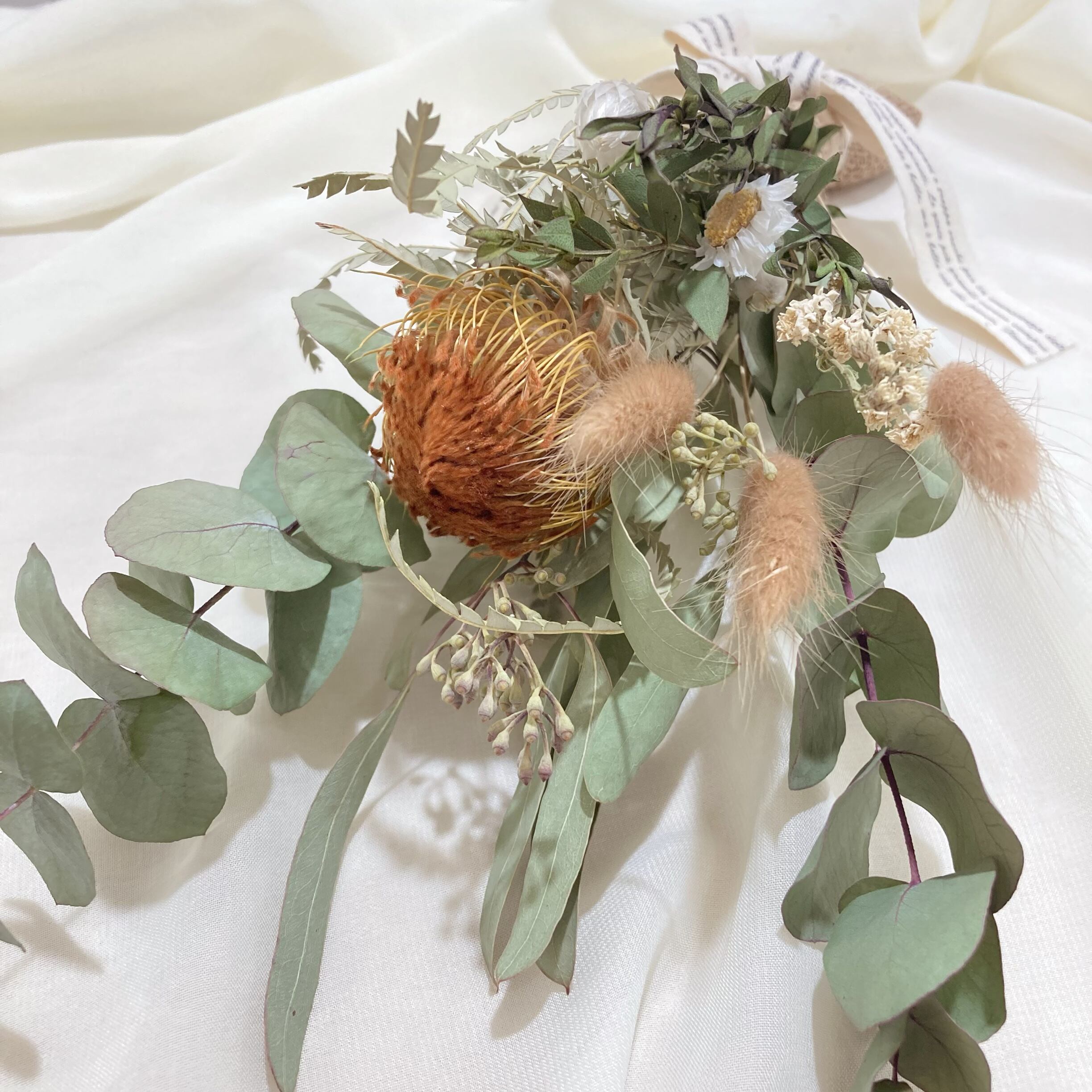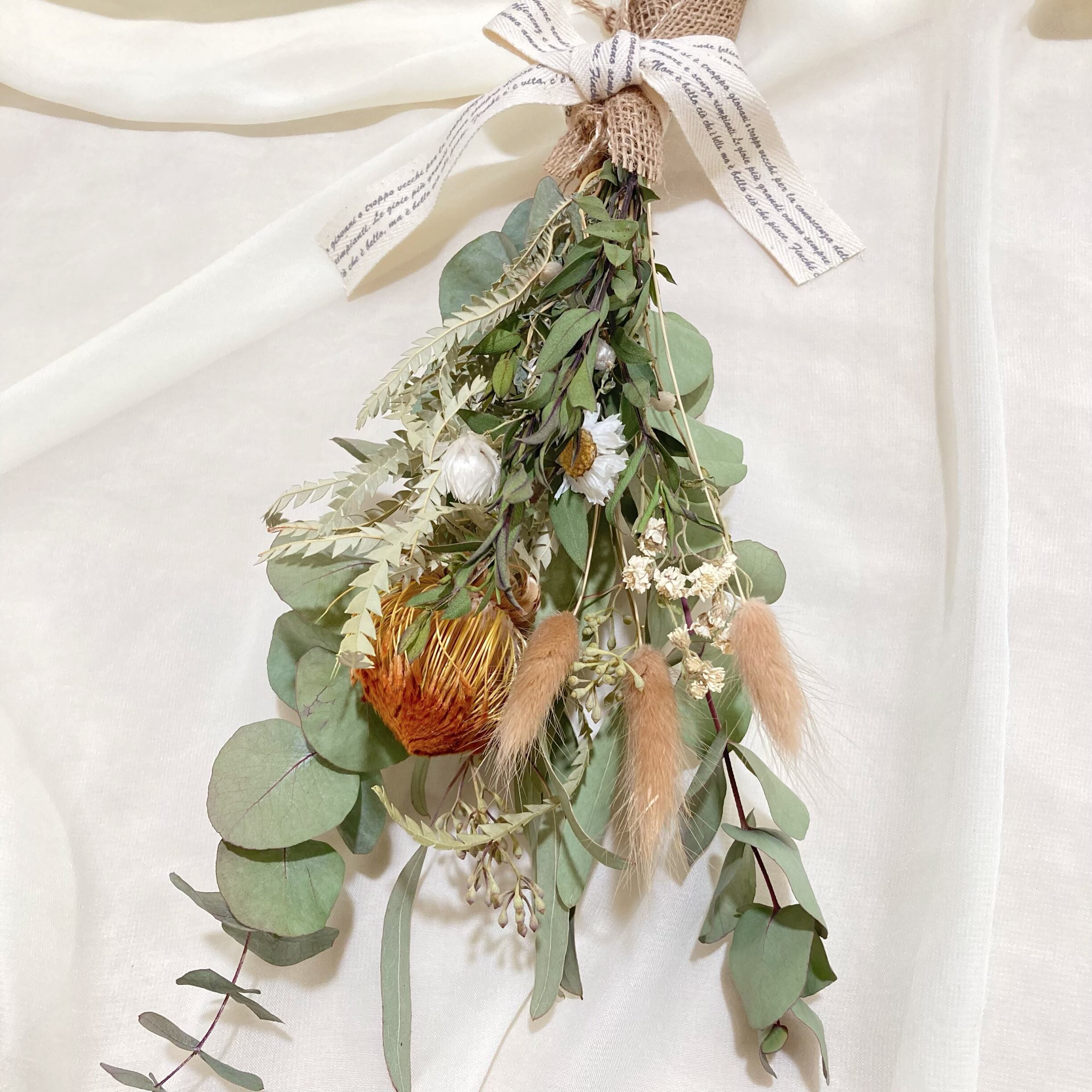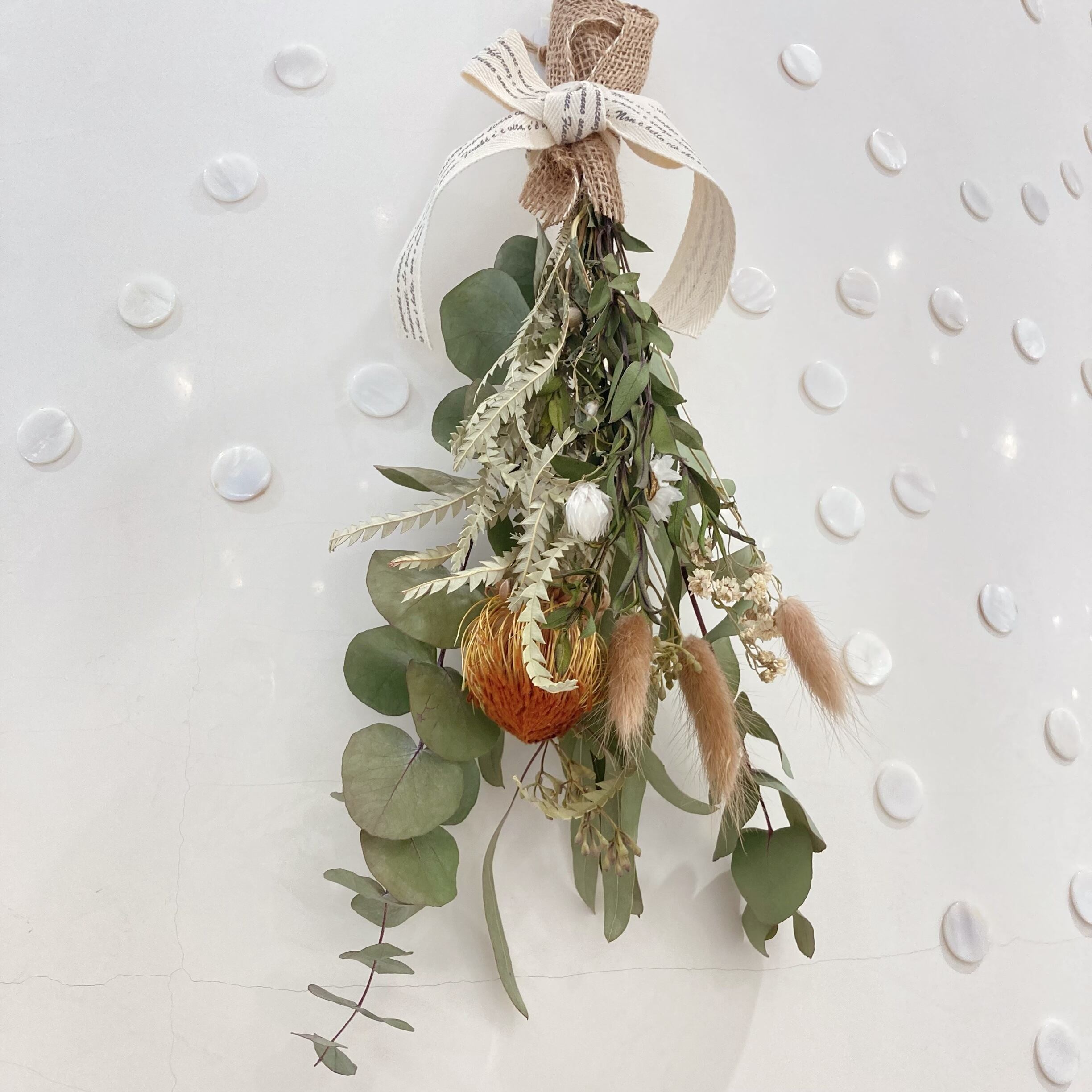 使用花材:ユーカリ、ローダンセ、アキレアパール、ラグラス