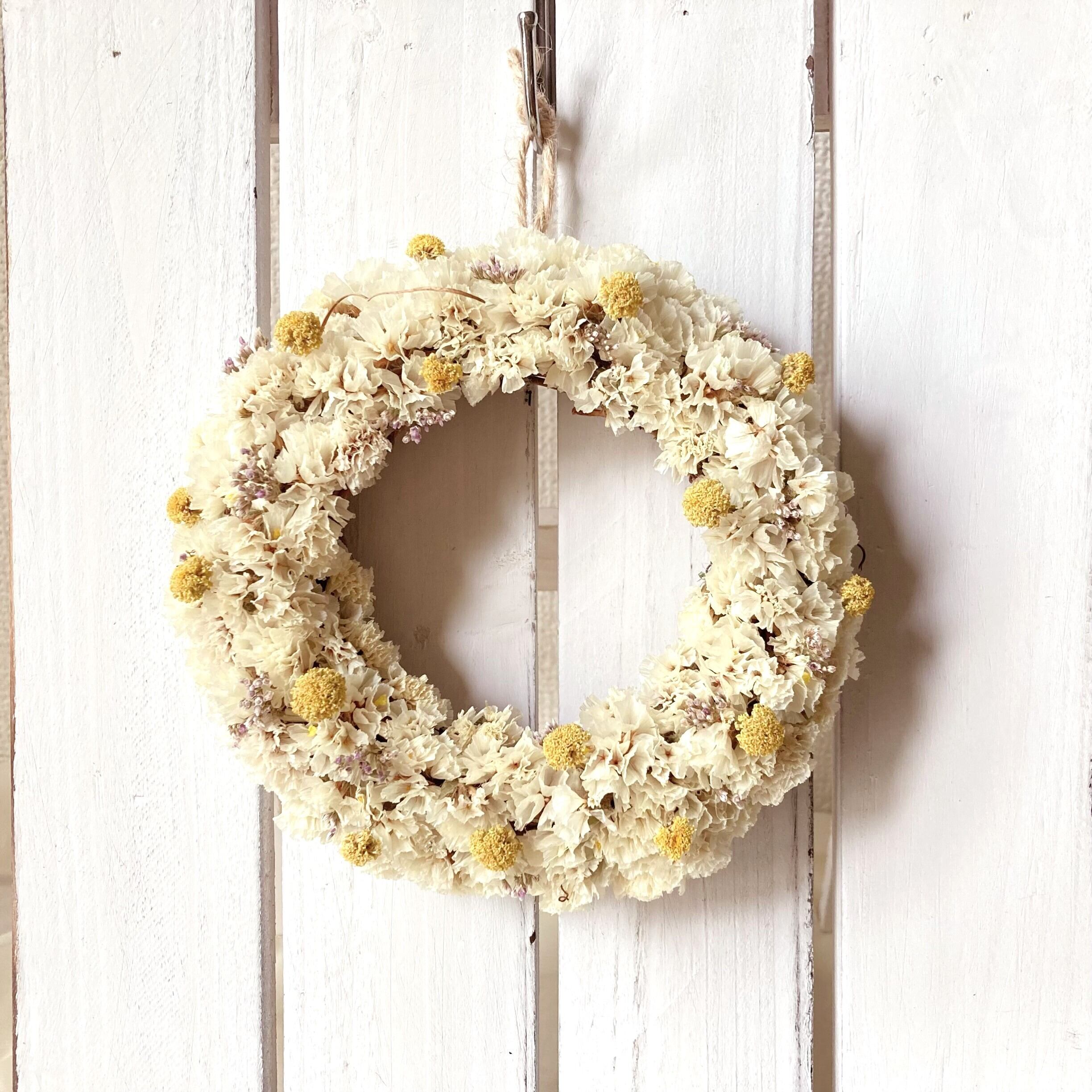 爽やかなホワイトのスターチスをたっぷり使用したリース