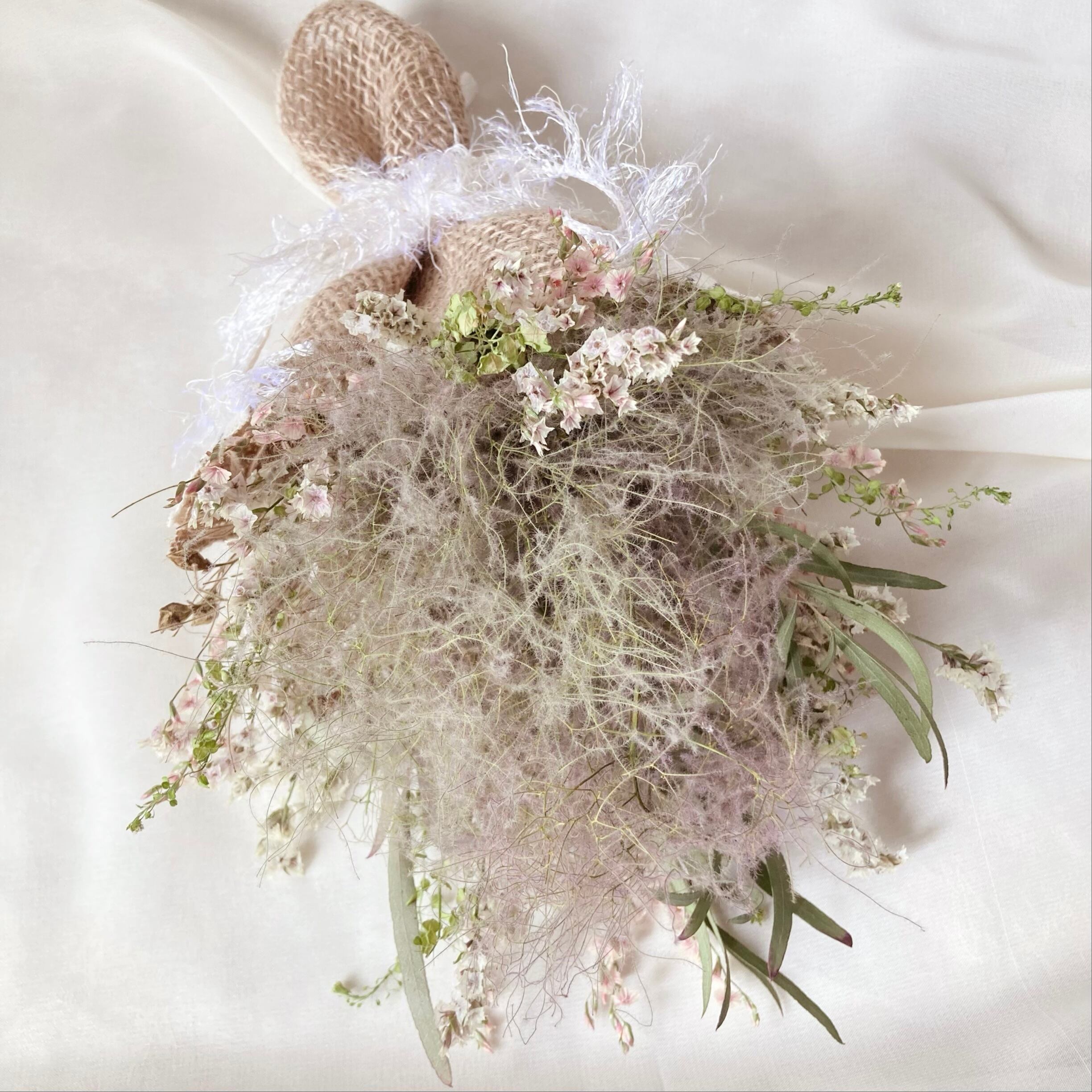 使用花材:スモークツリー、ユーカリ、タラスピ、スターチス、グリーンハート、リモニューム