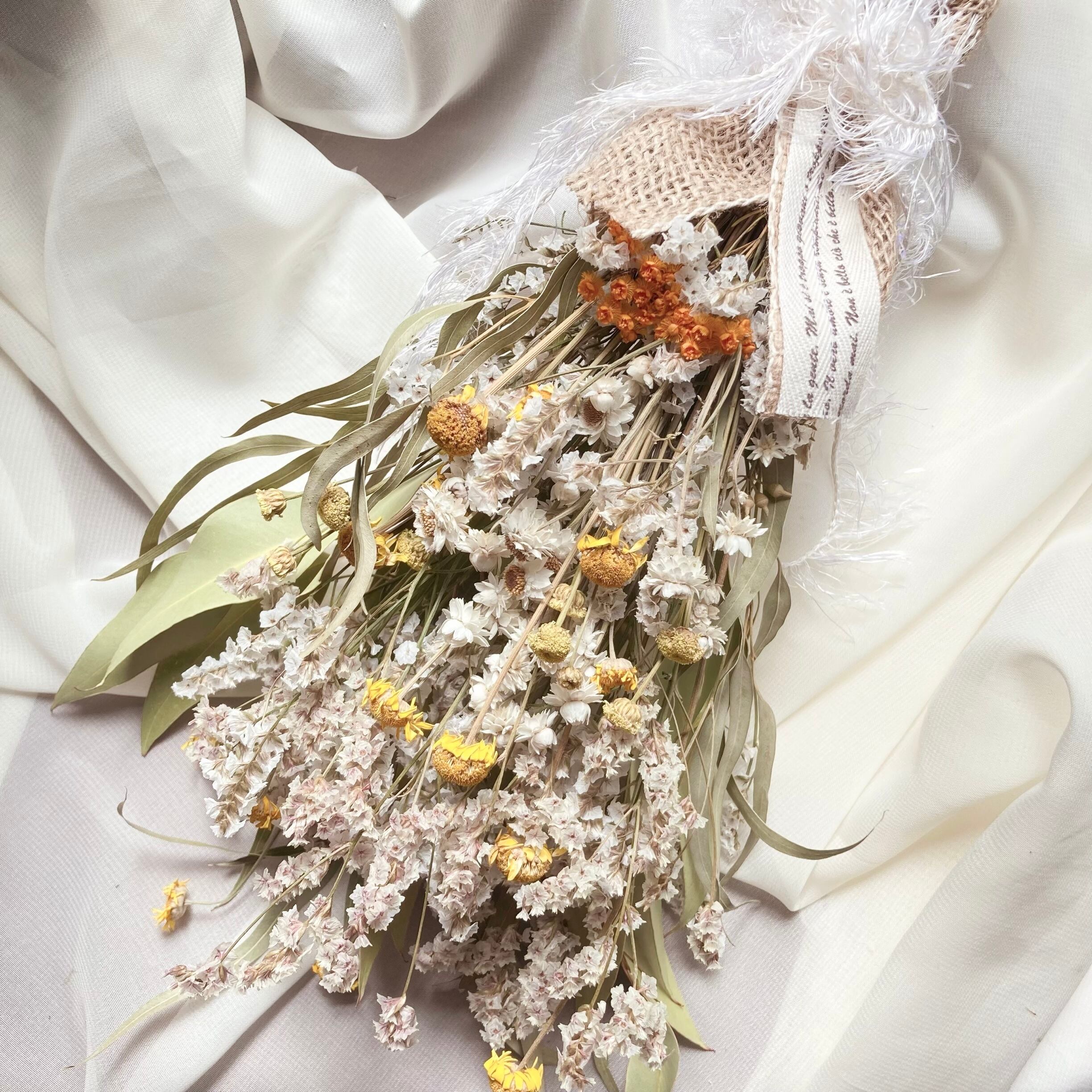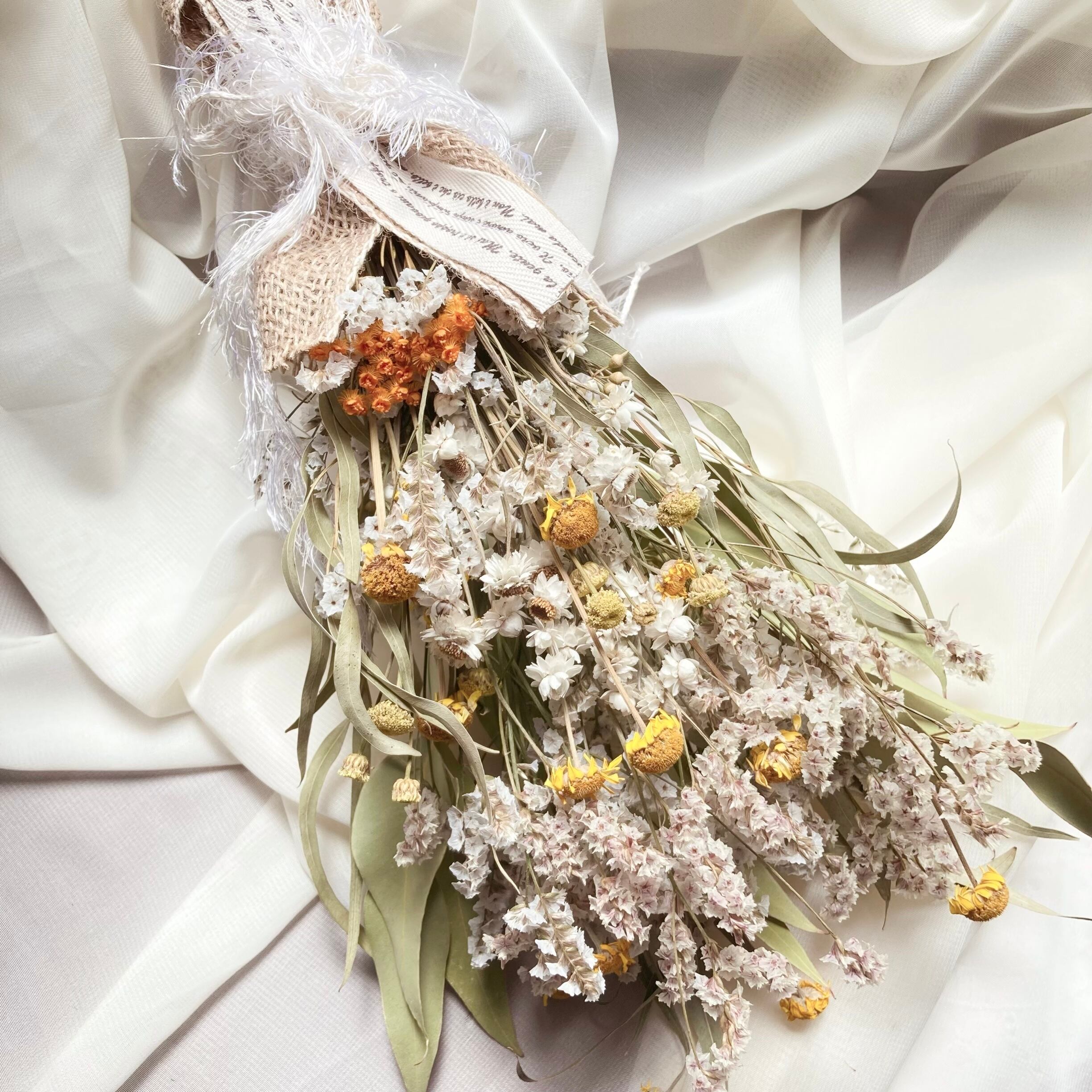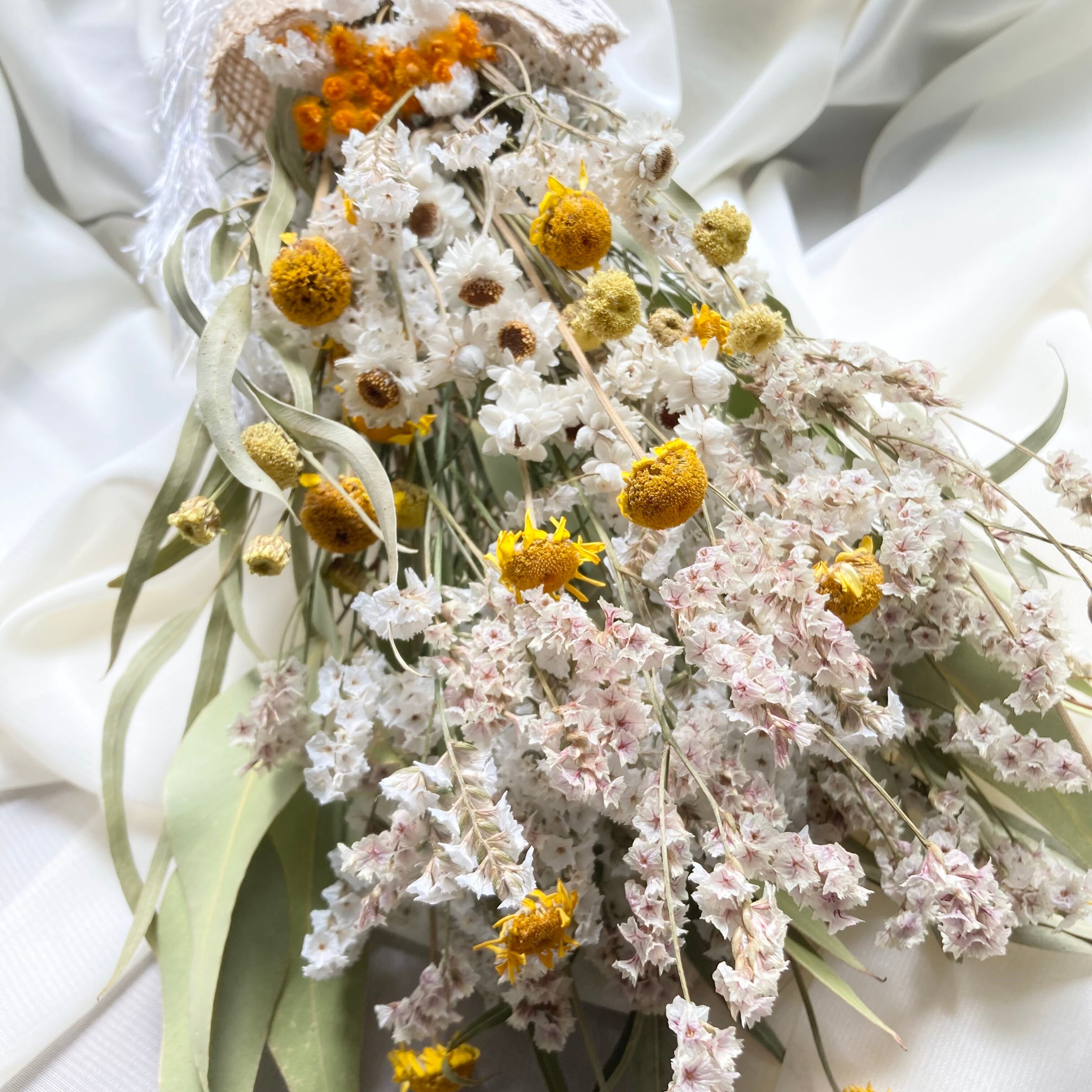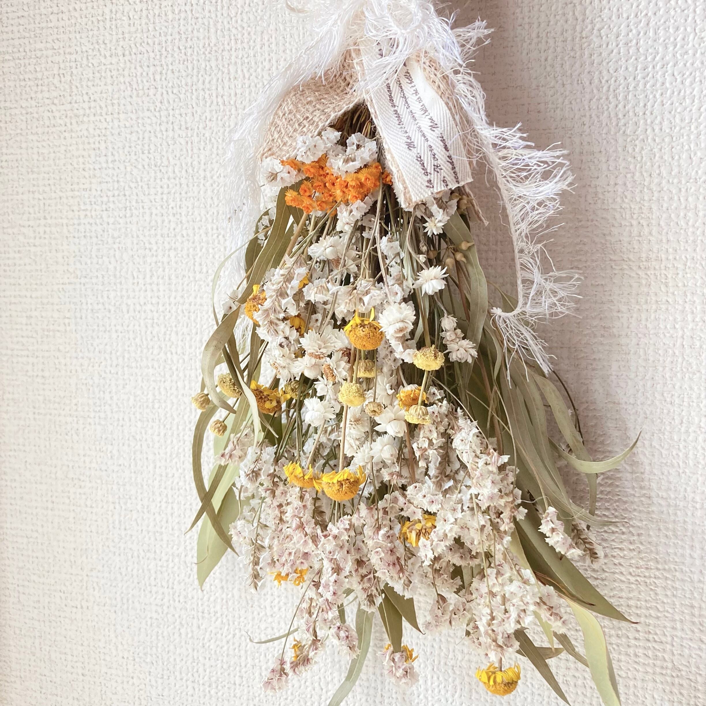 使用花材:アンモビューム、ユーカリ、スターチス、ダイヤーズカモミール、ニッテンオレンジ、サントリナ